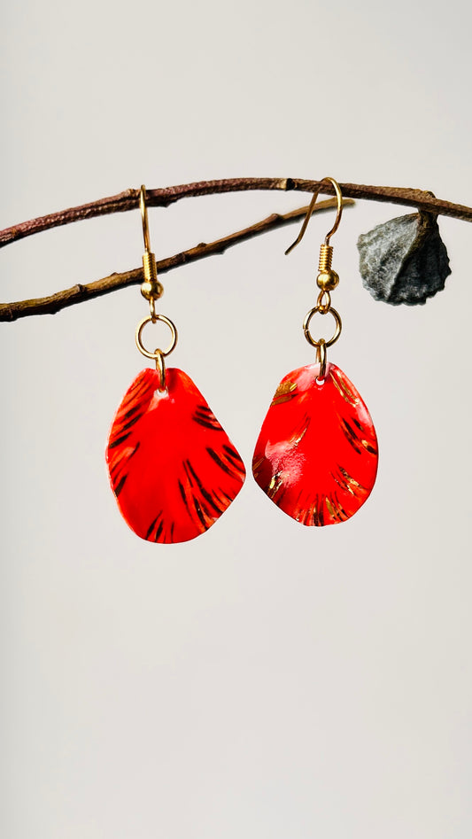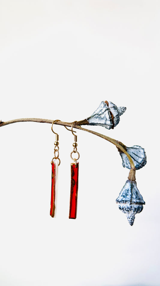 Long Red Porcelain Earrings with Gold Leaves — Handmade Ceramic Jewelry