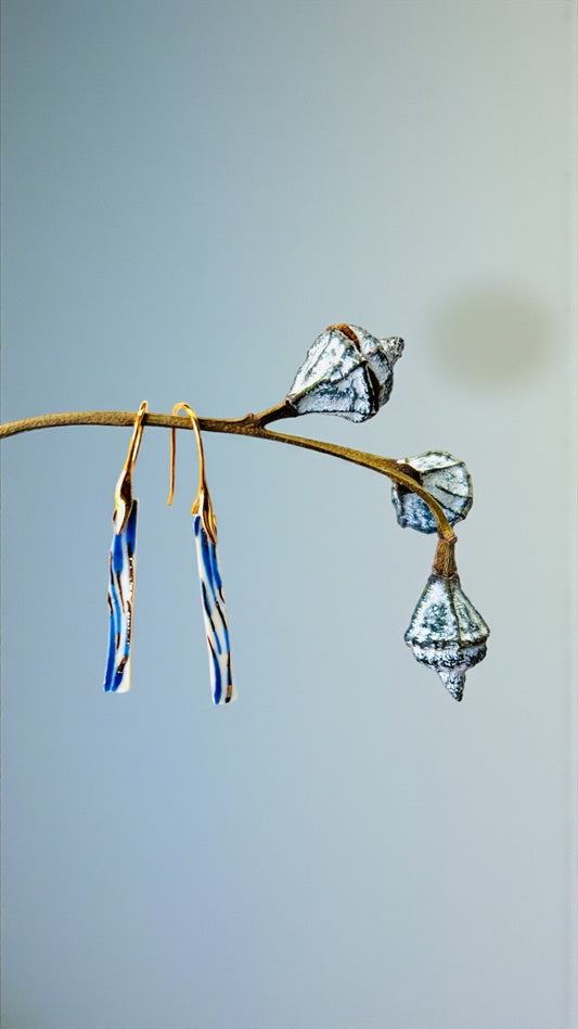 Memory of a Tide – Long blue Porcelain Earrings with 22k Gold Luster (Hand‑Painted Ceramic Jewelry)