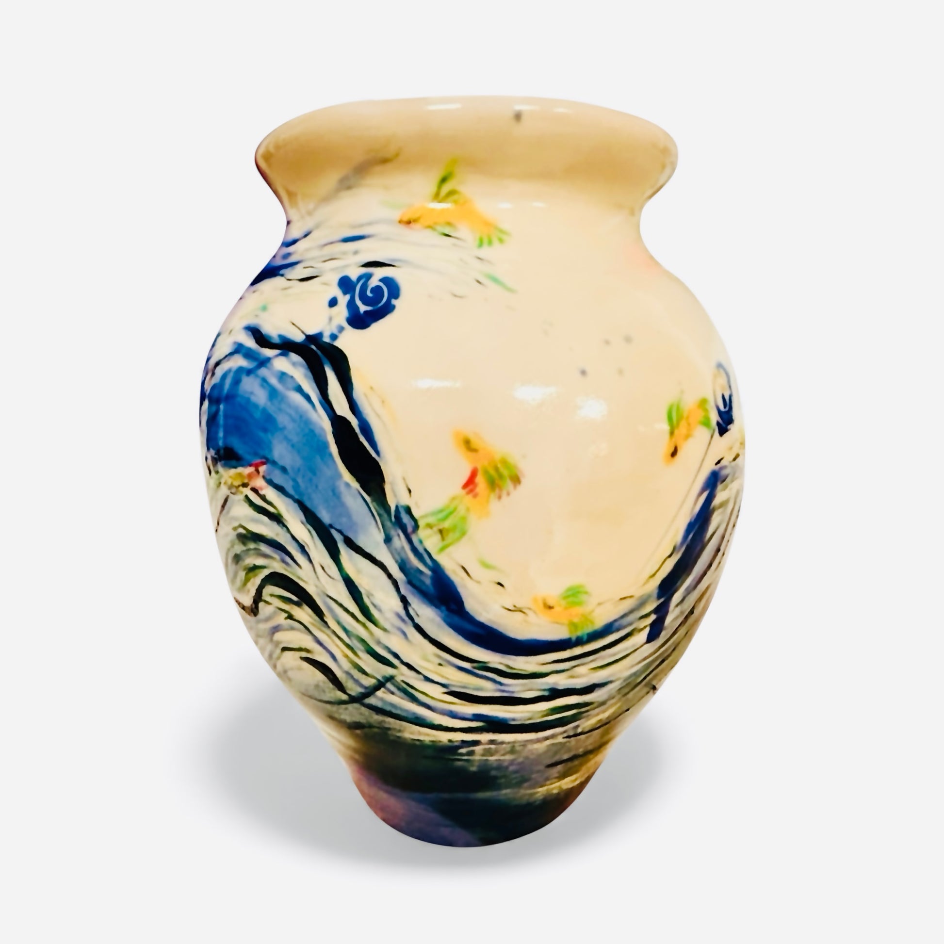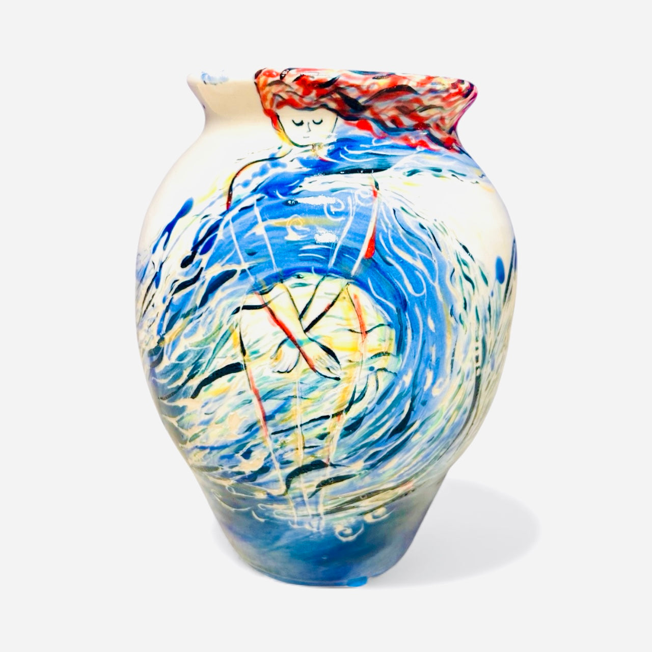 Stoneware vase, wheelthrown, handpainted with sgraffito highlights